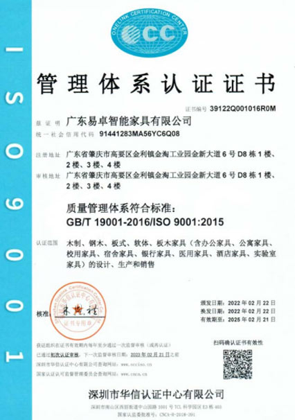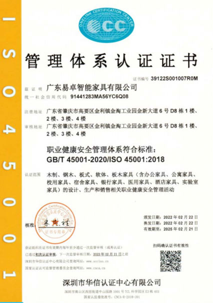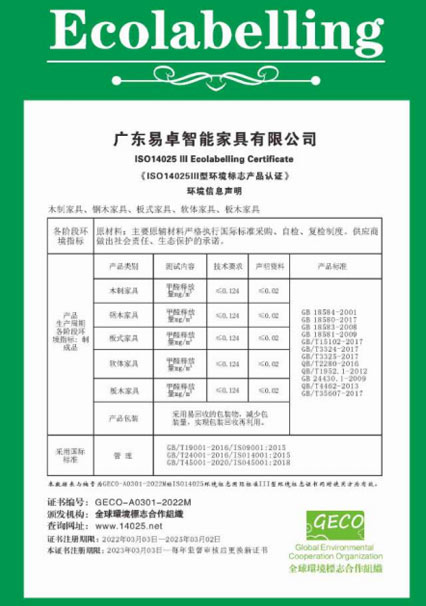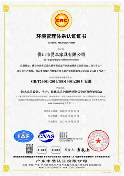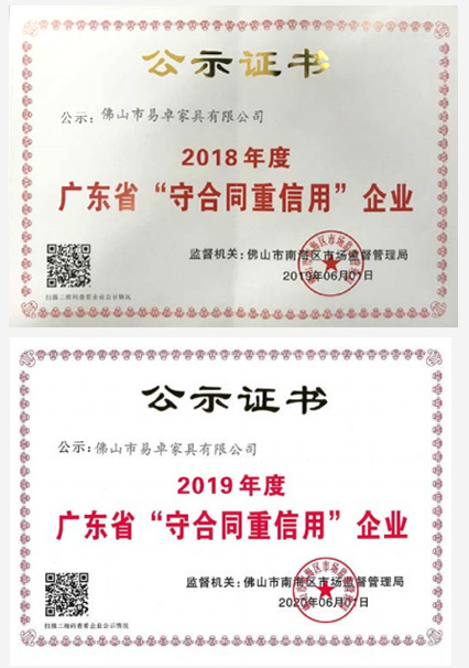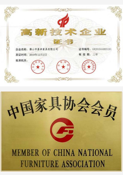 易卓人秉承“执着、专注、创新、激情、高效、感恩”的企业精神,这里聚拢着一批真正热爱家具的技术精尖的大工匠、设计师,抱着一种“做好一件事”的热忱,不花力气做广告,只花力气做产品,以利器为翼,创新为魂,凭借强大的技术实力及完善的管理体系获得,在业内先后通过了ISO9001质量管理体系认证、ISO14001环境管理体系认证、ISO45001 职业健康安全管理体系认证、知识产权管理认证、环保产品认证、中国环境标志认证及采用标准产品认证等认证;拥有发明、外观、实用性等专利 36 项,并于2017-2019年连续三年荣获了“广东省守合同重信用企业”称号、于2019年获得了“高新技术企业” 证书及“广东省著名商标”、“广东省名牌产品”等荣誉称号。