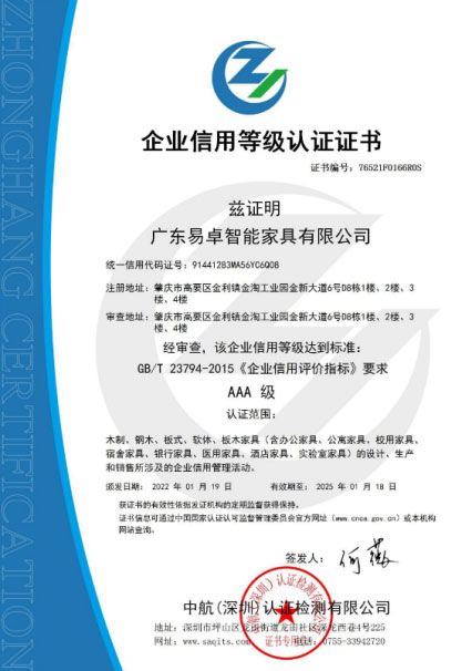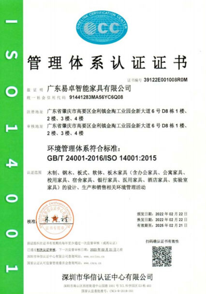 易卓人秉承“执着、专注、创新、激情、高效、感恩”的企业精神,这里聚拢着一批真正热爱家具的技术精尖的大工匠、设计师,抱着一种“做好一件事”的热忱,不花力气做广告,只花力气做产品,以利器为翼,创新为魂,凭借强大的技术实力及完善的管理体系获得,在业内先后通过了ISO9001质量管理体系认证、ISO14001环境管理体系认证、ISO45001 职业健康安全管理体系认证、知识产权管理认证、环保产品认证、中国环境标志认证及采用标准产品认证等认证;拥有发明、外观、实用性等专利 36 项,并于2017-2019年连续三年荣获了“广东省守合同重信用企业”称号、于2019年获得了“高新技术企业” 证书及“广东省著名商标”、“广东省名牌产品”等荣誉称号。